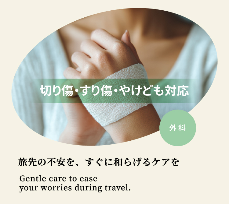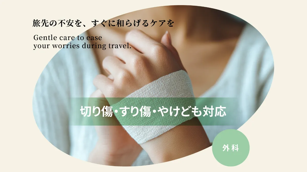旅先や出張中の思わぬケガや痛みに、専門医が迅速に対応します。切り傷・擦り傷・やけど・打撲などの外傷や軽度の外科的処置に幅広く対応。海外からの旅行者やビジネス利用の方にも安心の英語診療を行っています。早期回復をサポートし、大切な予定を中断しないための医療を提供します。