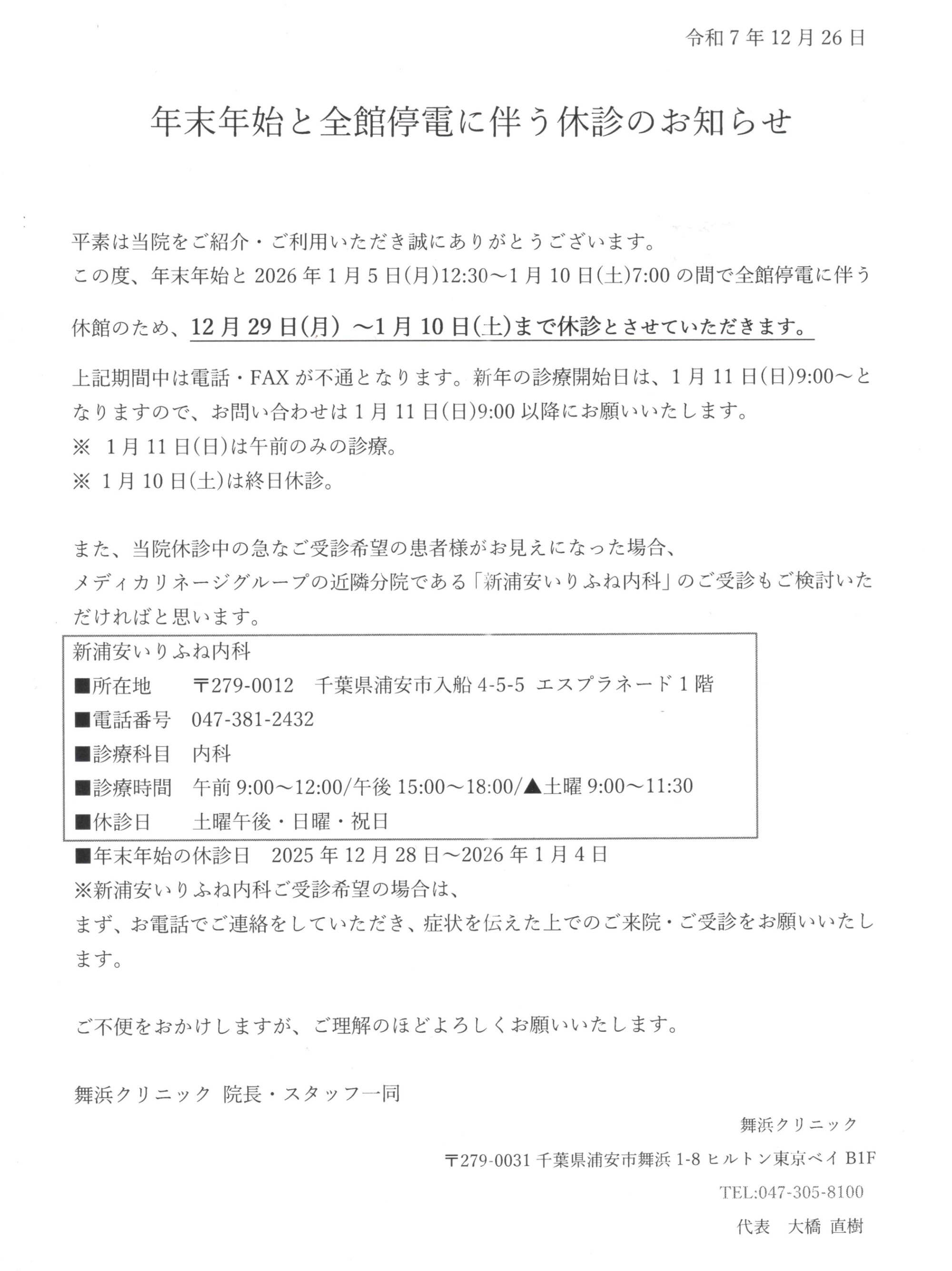 これからも、地域の皆様、観光で訪れる方々、そして舞浜で働く方々の健康を支える存在であり続けることを目指してまいります。どうぞよろしくお願い申し上げます。
